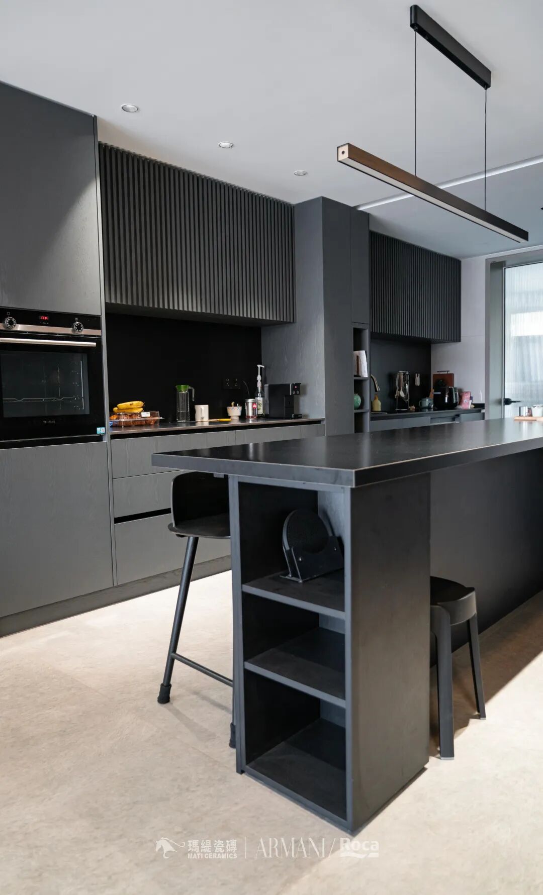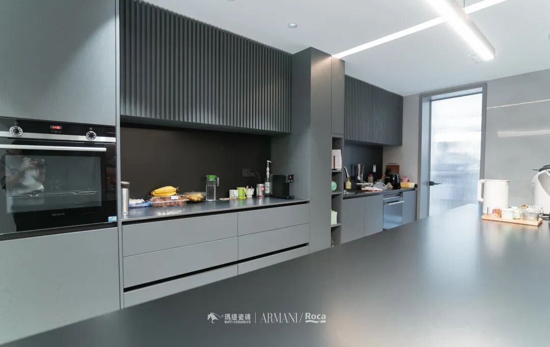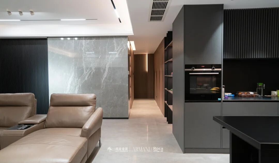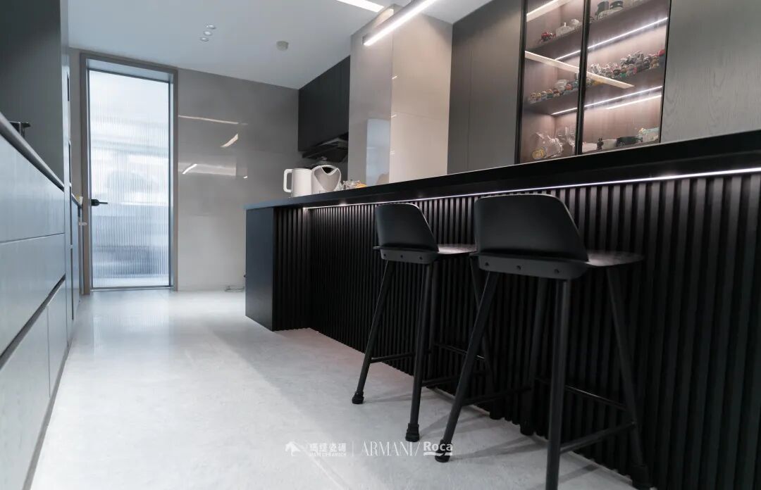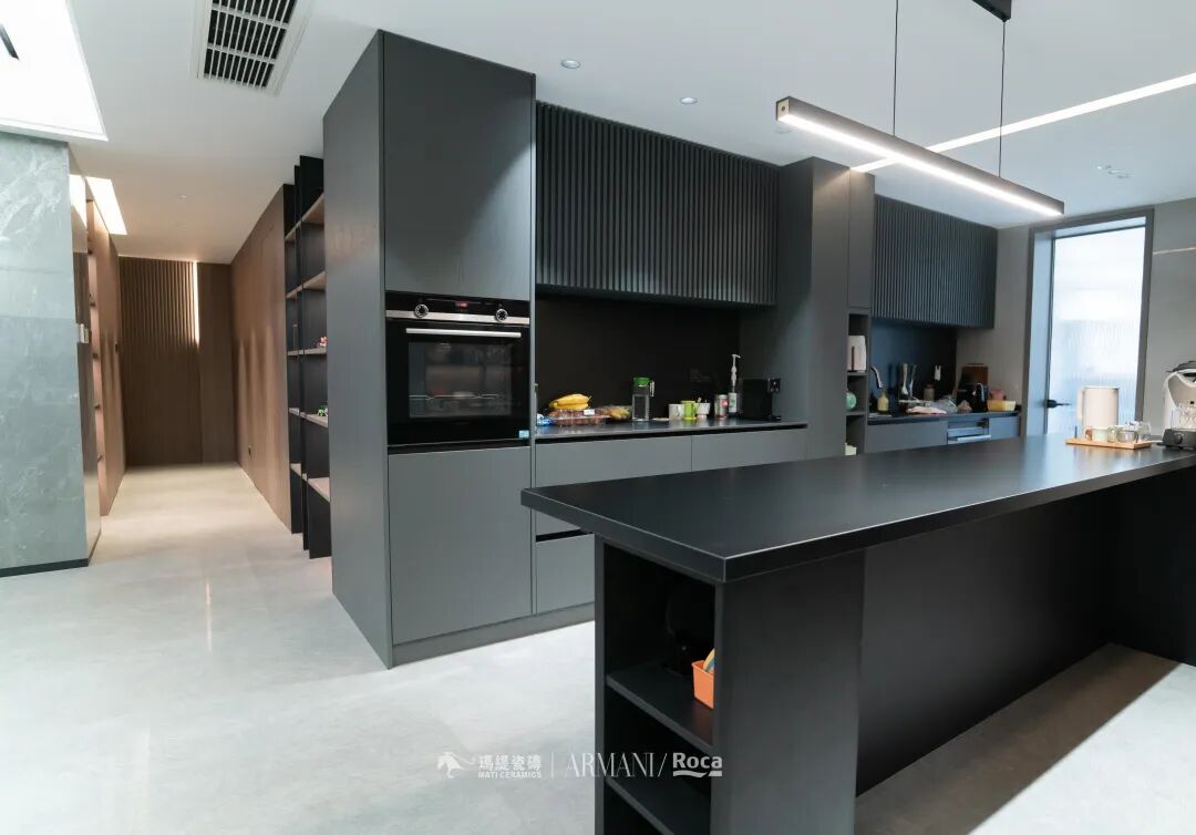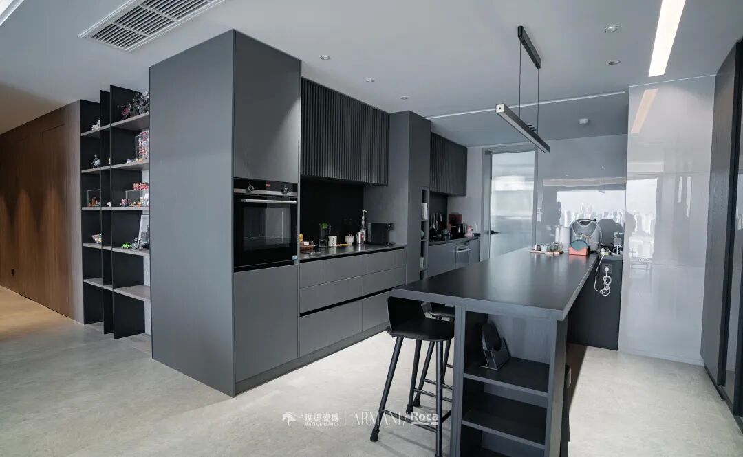 生活品质要从吃饭体现,这里既是岛台又是餐桌,没有采用高低台,看起来更流畅更平整。黑色的质感也是无与伦比的,视觉效果干净整洁。