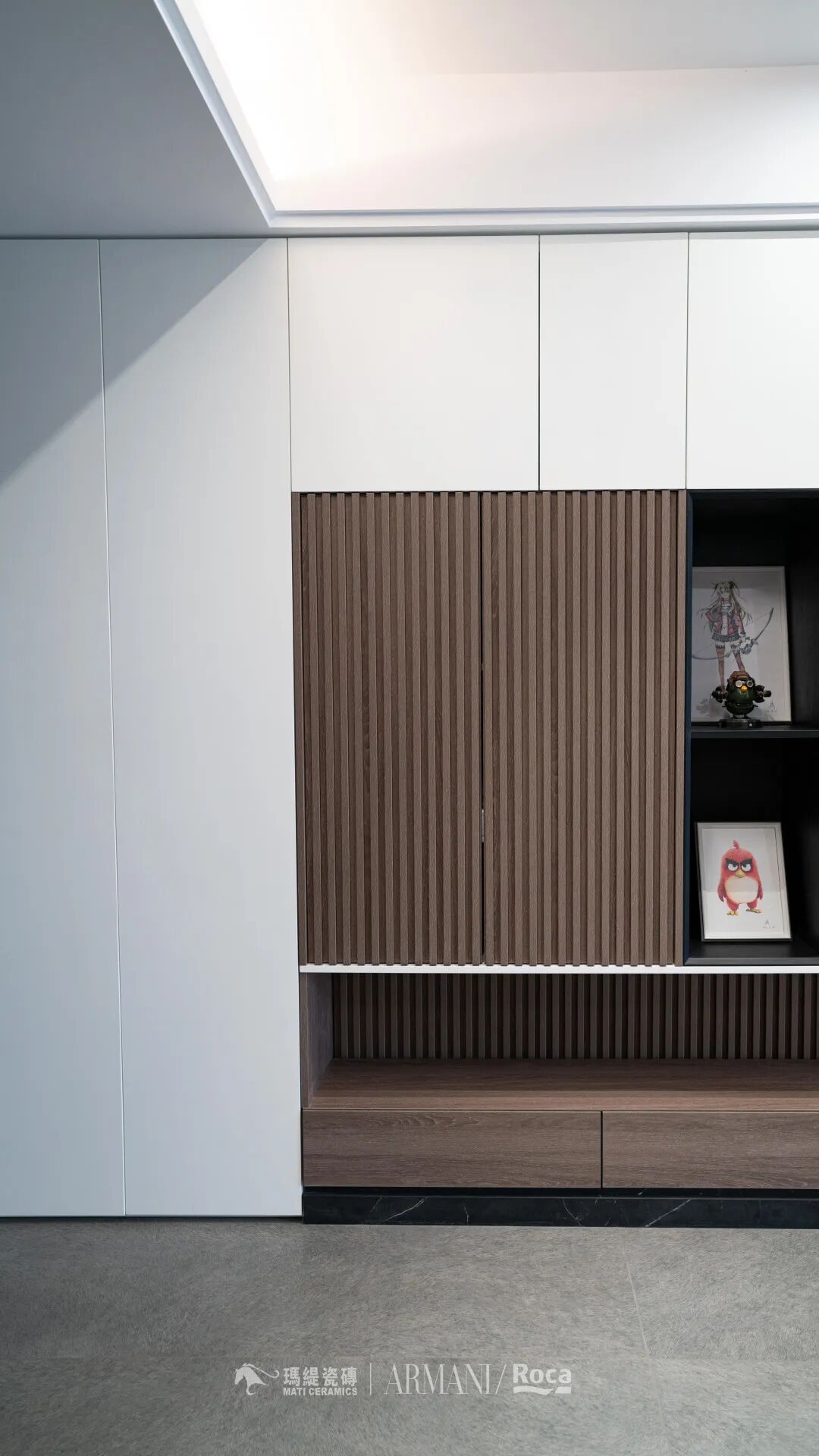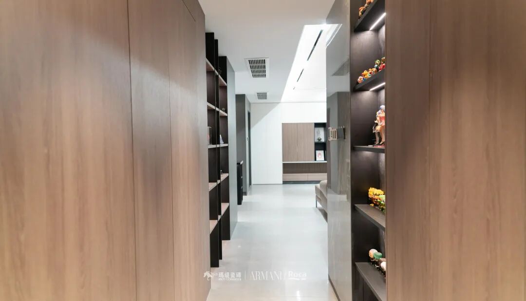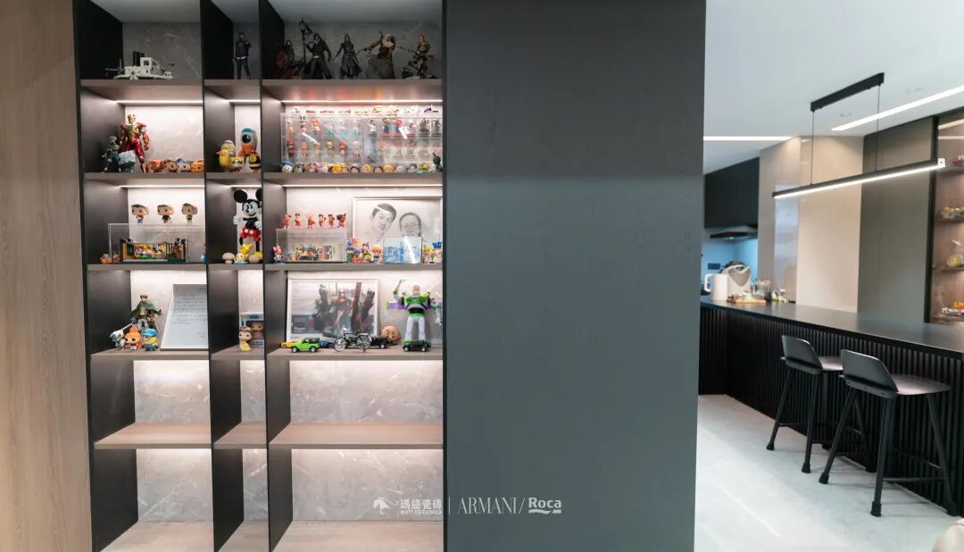 这两面墙真的太爱了。设计师在过道两侧设计了内嵌通顶的手办展示柜,简约大气,充满不凌乱的秩序美,这是生活的展厅,填满手办墙的过程就是生活中被幸福填满的过程。