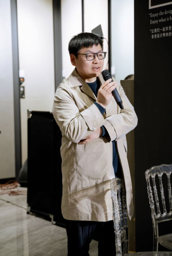 知名设计师苟洪涛老师结合自己的设计为大家做了分享,他说生活需要浪漫,要有诗意有幻想,所以在产品设计里就幻想了钢铁世界里面的柔情。玛缇瓷砖看似硬朗的外表下,藏着很多细节。它有金属的感觉,有陶瓷的感觉,甚至在它的外表下通过你的想象能看见沙漠,甚至看见星空。将玛缇瓷砖与设计的空间做了一个完美的结合,实现了产品设计上的浪漫愿望。